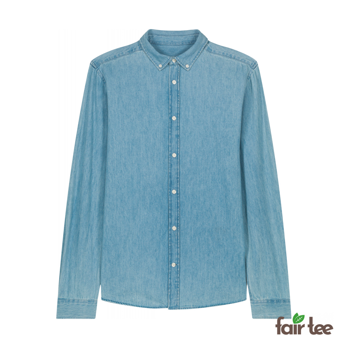 This denim shirt features a classic look with a button-down collar and single needle topstitching along the collar and front. The shoulders are forwarded, and the back has a yoke for a comfortable fit. The sleeves include cuffs with two buttons and rounded corners for a refined finish.